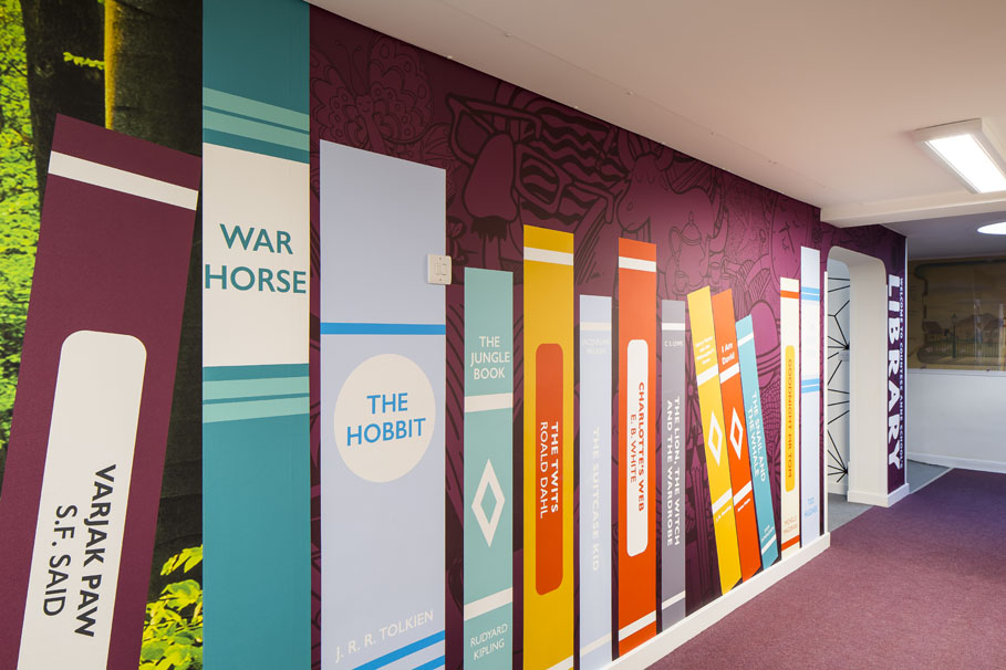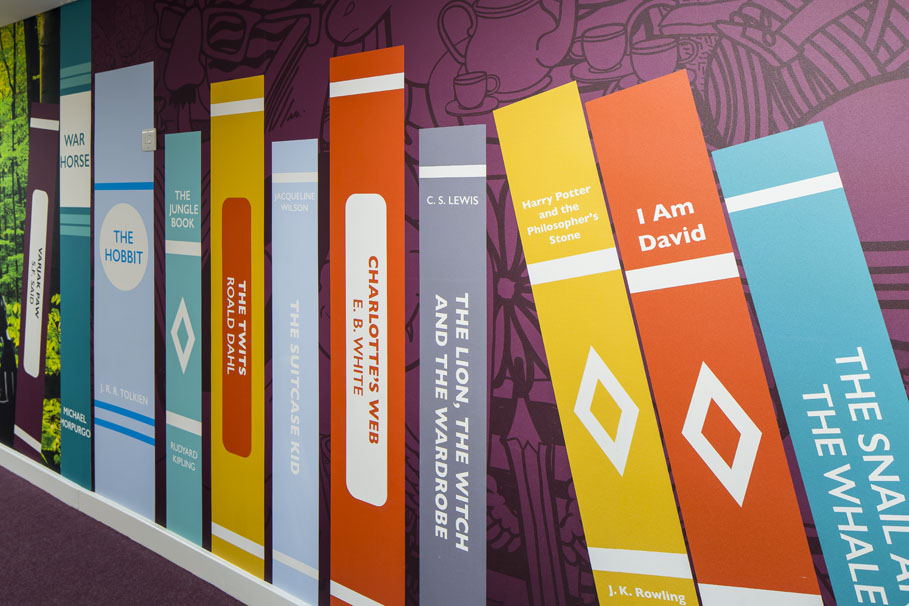 The library corridor art is designed to stimulate a natural interest in reading, with a celebration of books and popular titles.