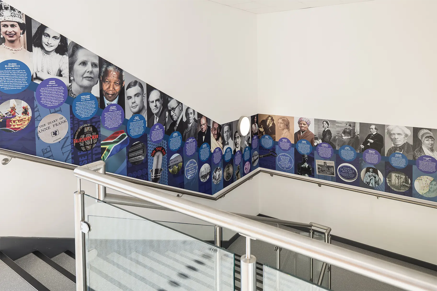 We design all timelines in-house and bespoke to each school’s requirements. History is a popular subject, but we can also design a timeline to showcase a subject from your curriculum, innovation, business and technology, diversity or your school’s own history.