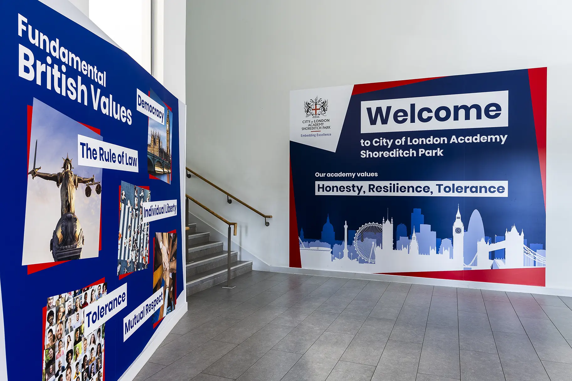 Use a large wall space in your reception area to welcome visitors and communicate your values at a glance. You can also include your motto and values alongside British Values and core statements about your school and the wider community.