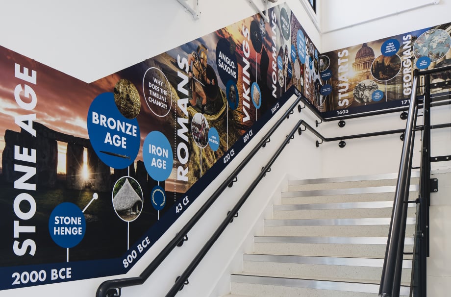 Some of our favourite History timelines include an extra large feature wall for Churchfields Junior School and a beautiful stairwell design for St Matthew’s CofE Primary School.